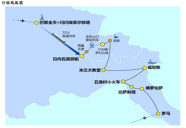 用餐标准 餐标升级!中式 7 菜 1 汤 +全程美式热早 + 1 顿【巴黎塞纳河游船午宴】 + 1 顿【意大利 T 骨牛排三道式】 + 1 顿【威尼斯海鲜墨鱼面三道式】 + 1 顿【瑞士少女峰雪山中餐】